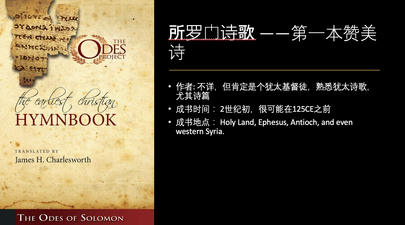 下面来看最早的赞美诗《所罗门诗歌》。 学者们认为作者不详,但肯定是一个犹太基督徒,他熟悉诗篇;成书时间在2世纪初期,很可能在公元125之前;成书地点大概在耶路撒冷或者安提阿地区;目前主要是两个叙利亚语手稿,早期还有翻译成希腊文的,有部分译成了科普特文。可见,早期叙利亚和科普特联系也很紧密。