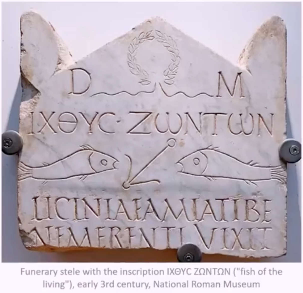 另一个代表基督徒和基督教的标志就是鱼。把“鱼”的希腊字拆开,其字母可以跟「耶稣基督,神之子,救主」的希腊语首字母一一对应。其他还有一些常见的标志,比如船,寓意把人从此岸载到彼岸去;或是一个锚,代表基督徒的盼望。为什么会出现这些并非基督教专属的标志呢?有一种解释比较合理,就是在比较早期的时候,基督徒群体当中缺少自己的艺术家和工匠,以及自己的表达方式。所以他们选择借用这些希腊罗马文化和社会中已经有的,来表达和传递自己的信仰。