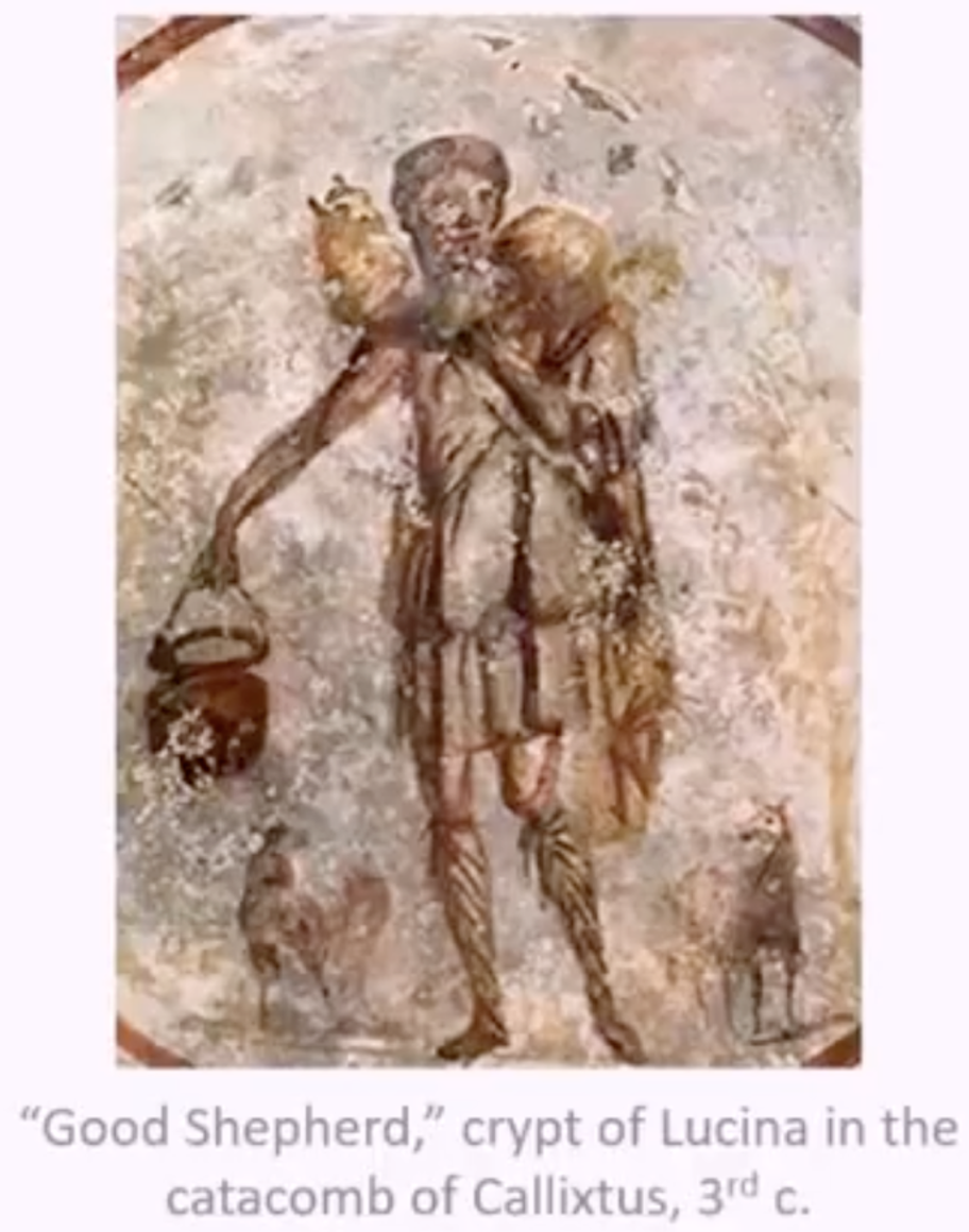 一个更加明显的例子,就是这个地下墓穴顶端的一幅壁画。我们大概可以分辨出这是一个年轻人,肩上扛着一只羊。从圣经来看,这就是约翰福音里面说的,耶稣是好牧人。