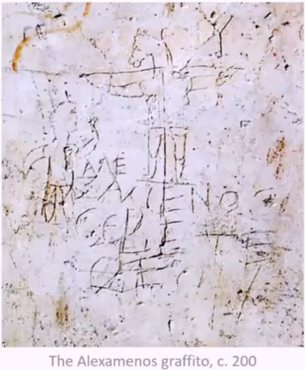 而今发现最早的十字架的表述是这个Alexamenos graffito,出土于罗马旧城的核心位置。是凯撒宫殿区一组刻在墙上的涂鸦。图画中有一个人,即Alexamenos,在敬拜他十字架上人身驴头的神。考虑到这个涂鸦的内容和位置,一个合理的解释指向罗马人对他们所认识的基督教的嘲弄——基督徒敬拜一个被钉在十字架上长着驴头的神。这一嘲弄折射出罗马主流社会对基督教的误解,带有不屑和敌意。这大概是公元200年前后的东西。