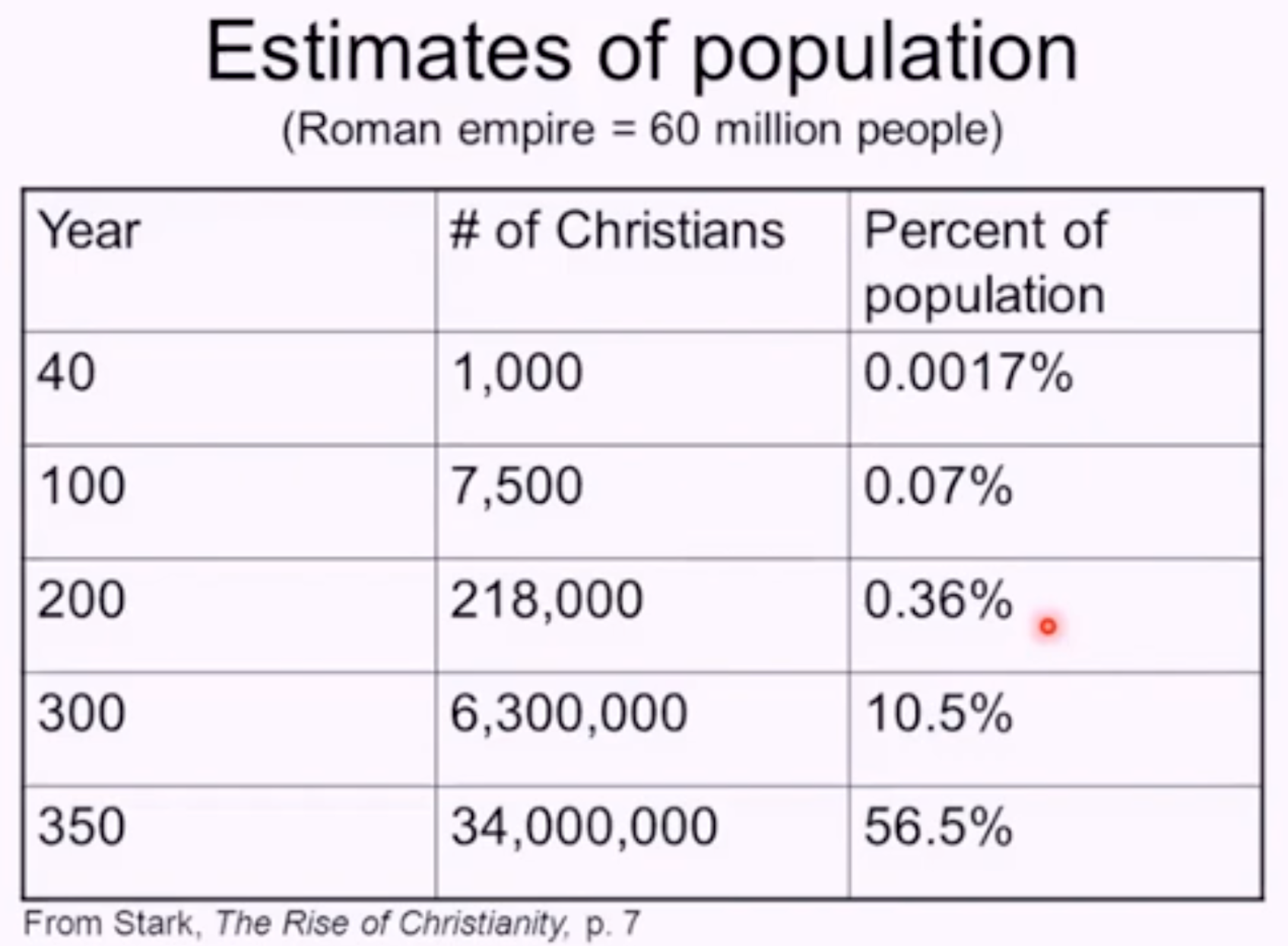 这里引用一个社会学家对早期基督徒的人数做的估计。从方向上看,从一世纪到二世纪,基督徒有稳定而缓慢的增长。人数增长最快的这段时间,从不到0.5%一跃超过10%,是在公元三世纪。在这样的人数增长之下,局面开始发生改变。