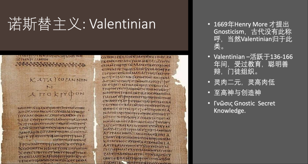 谈到诺斯替主义的特点,首先要讲一下瓦伦廷(Valentina)这个人。他活跃于136年至166年间,曾是一位非常有名的教师。他受过很好的教育,聪明善辩,有很多的门徒。他们利用耶稣的名号也组织起一个教会,但他们的教导与传统教会却不一样。