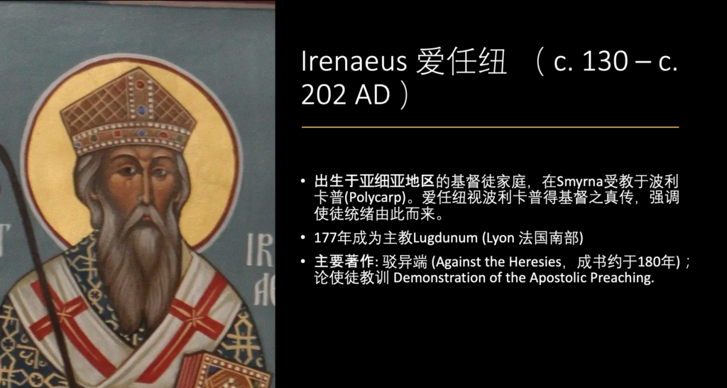 首先声明,我不是研究爱任纽(Irenaeus)的学者,但我参考了一些相关的文献,这里对他进行一个概略性的介绍。此外,任何人讲历史都带有他的历史视角,我也不例外,我的教会历史课自然带有东方教会的视角。我的这门课程并不能取代你们在其他地方上的教会历史课。因为在漫长的历史过程中,任何一个教会历史或人物都会有很多与其相关的文献、有众多的视角可以供我们参考和学习。也许另外一位学者站在一个新教徒的角度来讲教会历史,同样也是讲爱任纽,但他的视角、采用的史料也不会和我一样。我采用的史料和讲课的方式是通过阅读一手材料,总结出我对爱任纽这个人物的解释,这是我的基本方法论。我是站在一个东方教会视角来阅读教父著作,而不是带着天主教或新教的视角来看待这些教父文献。