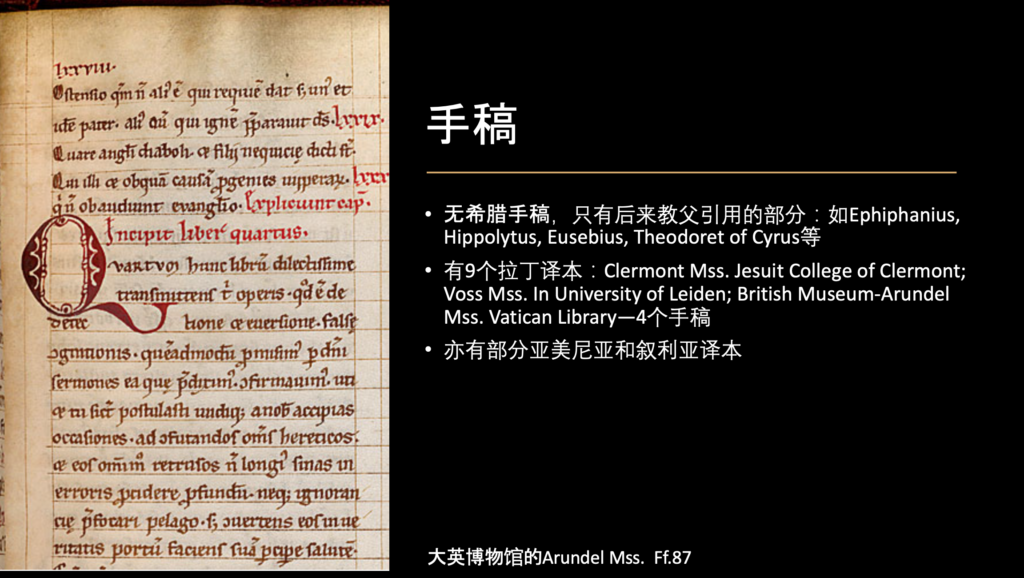 我们简单地探讨了他的生平之后,现在来探讨一下他的手稿。很不幸的是,他的希腊语手稿没有存留下来,仅存的著作内容都源于后来一些教父们的引用。他的《驳异端》最初用希腊文写成,由于当时他身处的法国南部通行拉丁语,所以此著作很快就被翻译成了拉丁文。目前有九个拉丁译本,还有一些亚美尼亚文和叙利亚文译本存世。我们今天探讨的内容主要是根据一个拉丁译本而翻译的英译本。请看左边这幅图,这就是大英博物馆存有的一个拉丁文手稿。目前,这四册由拉丁文整理出来的校勘本比较有名,很多的译作都必须参考这个版本。这张图就是他其中一部著作《驳异端》,另外一张图是教导使徒遗训的著作。它也属于一手材料,如果大家有兴趣可以参考