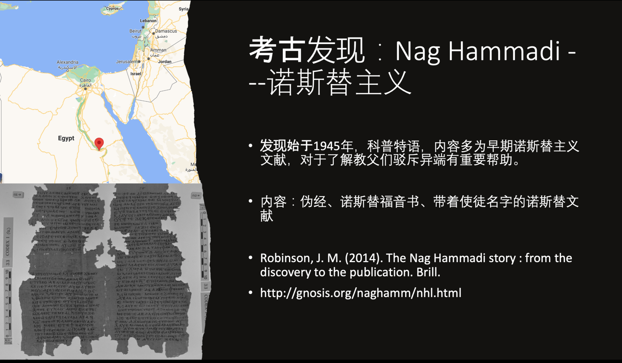 谈到爱任纽,我们不得不谈到在二十世纪四五十年代的一个新发现。在埃及,就在这张图中标红点的位置,在尼罗河下游的这一地区,有一个叫纳格哈马地(Nag Hammadi)的地方,学者们发现了很多诺斯替主义的文献。它们主要用科普特语写成,其中包含很多早期的诺斯替主义文献,如《彼得福音》、《约翰福音》这些被初代教父们称之为伪经的著作。这些文献对于我们了解爱任纽护教的背景有很大的帮助。这张图的内容就是一些伪经、诺斯替主义的福音书,还有带着使徒名字的诺斯替主义文献,其中的细节这里就不做详细介绍了,如果您想对其有更深入的了解,我在这张PPT上推荐了一个网站。目前这是一个比较重要的考古发现,有很多的学者都在对其进行研究。