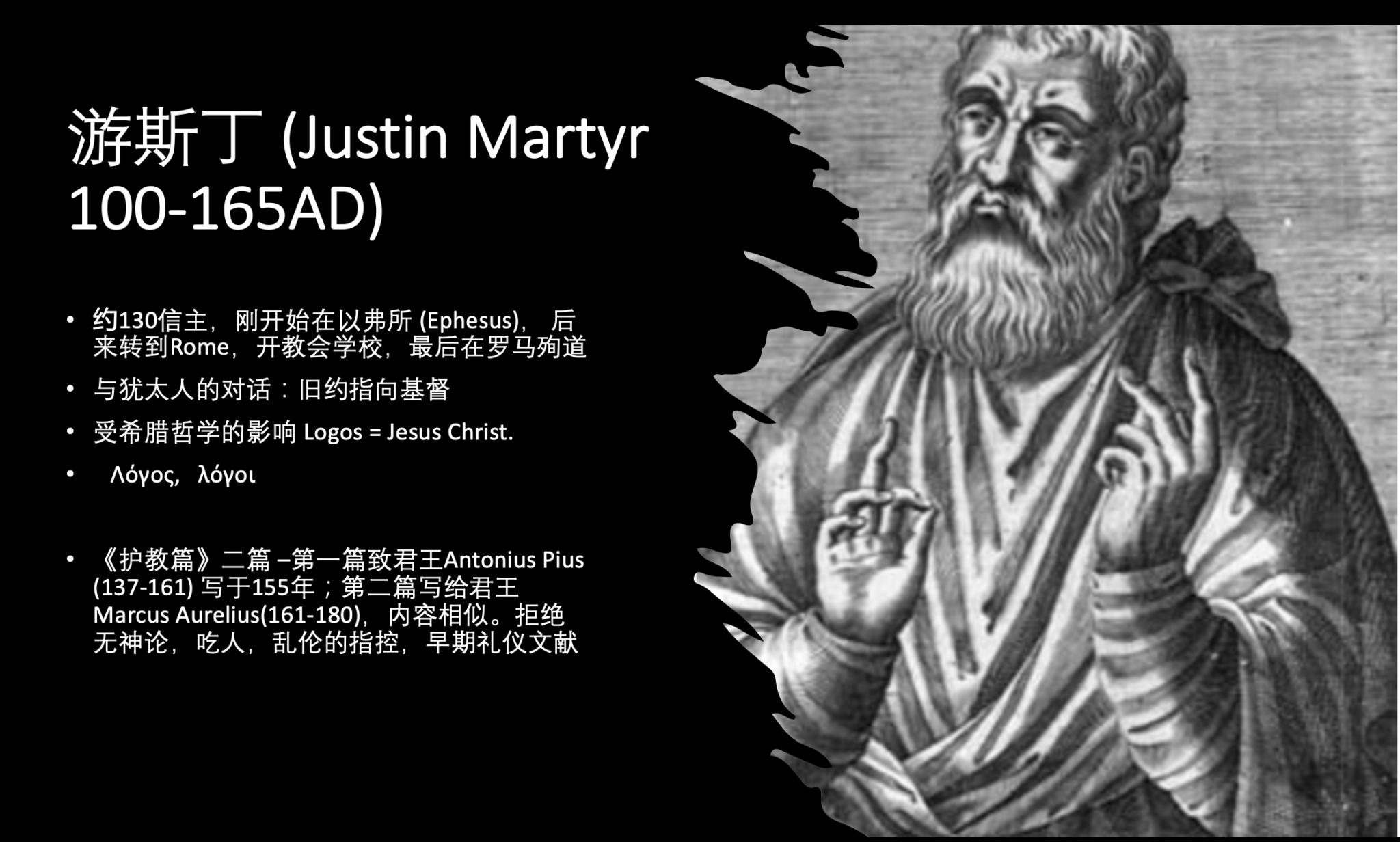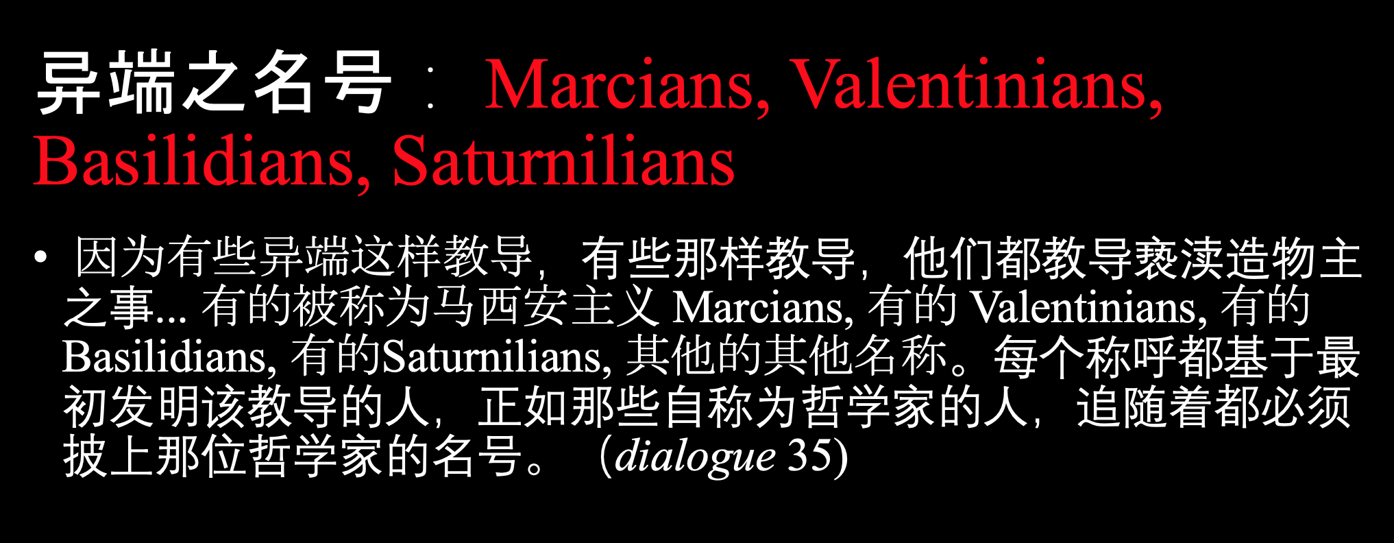 在游斯丁所处的时期,教会并非处于一种平安的状态,而是充满了内忧外患。关于“外患”我在上一次课中已经讲到过,它促使殉道精神得以体现。罗马帝国的掌权者认为基督徒不崇拜帝王影响了国家的安全。于是,掌权者开始逼迫基督教,很多的基督徒在这种情况下为主殉道了。那么“内忧”是什么呢?内忧就是当时的教会面临着很多异端的兴起。比如游斯丁在“与特里弗的对话篇”里这样说,因为有些异端这样教导,有些那样教导,他们都教导亵渎造物主之事,有的被称为马西昂派(Marcians),有的被称为瓦伦廷派(Valentinans),有的被称为巴西理德派(Basilidians),有的被称为萨图尼利主义者(Saturnilians),其他有其他的名字。每一个称呼都是基于最初发明该教导的人,正如那些自称为哲学家的人,其追随者也都必须披上这位哲学家的名号。(以上内容大意可参见《护教篇》的第113-114页)。其实,柏拉图主义者、亚里士多德主义者的名称也是这样来的,指的是追随他们理念的人,以上那些异端最初也是如此被命名。