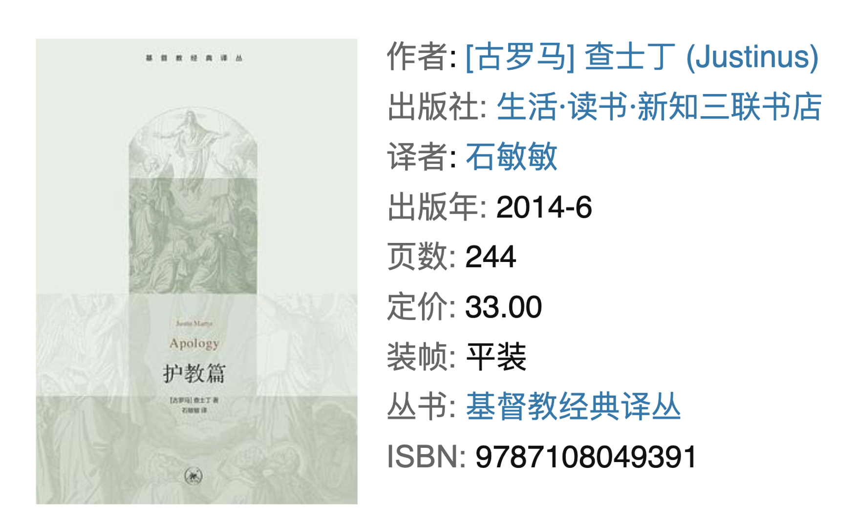 游斯丁就秉持了这样的理念。他可能是把希腊哲学家赫拉克利特(Heraclitus)的“logos”(道)这个概念等同于耶稣基督的第一人。他比较大胆地使用了不少希腊哲学的术语来解释基督教教义。他之所以被认为是护教士,一方面是因为他采纳了希腊哲学的一些概念释教;另外一方面,他拒斥了希腊哲学当中不符合基督教教导的内容。游斯丁成为基督徒后,最初在以弗所,后来到了罗马,并在罗马开设教会学校,最后在那里殉道。他的《护教篇》目前已有中译本,是一个研究早期教会的经典文献。在此著作里,他拒斥无神论;对指控基督教杀人、乱伦的说法提出辩护;记录了一些早期基督教如何进行崇拜的珍贵资料。此书包含“第一护教篇”、“第二护教篇”、“与特里弗的对话”,本书是由石敏敏翻译,三联书店出版。另外,应该还有一些他的其他作品仍没有被翻译完成。