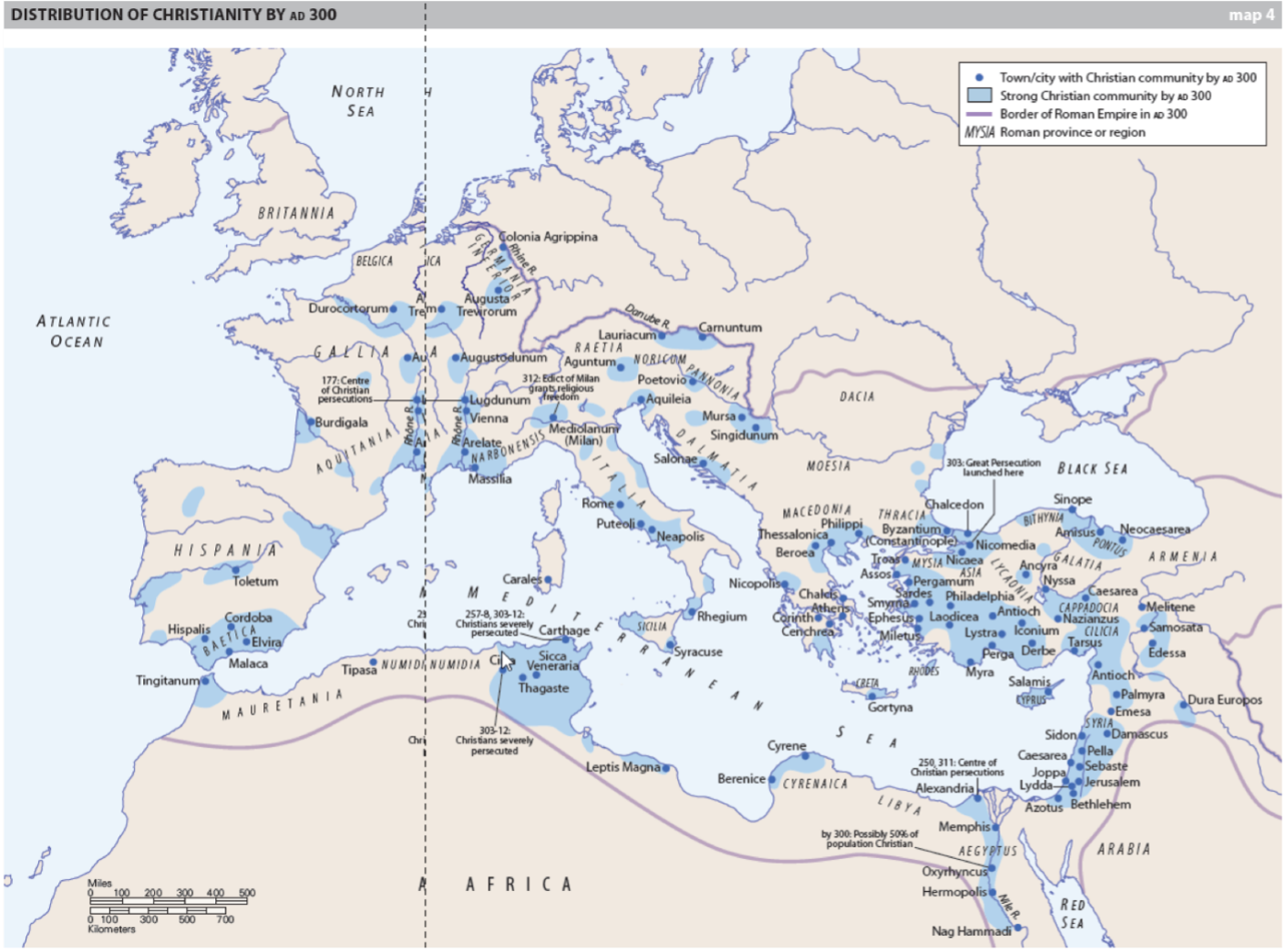 此地图显示了公元300年左右,基督教在罗马帝国,也就是地中海世界的分布状况。在西部和北部,当时基督教已经在罗马的高卢(现在的法国地区)、日耳曼(现在的德国地区)、西班牙、北非的大部分地区以及埃及扎根。它已经不仅限于城市,如亚历山大,而且已经沿着尼罗河扩展到了许多农村地区。然而,初期教会的重镇依然位于说希腊语的东方,如希腊、小亚细亚(现在的土耳其)、巴勒斯坦和东边的两河流域。所有蓝色区域都是基督教社区影响力较大的地方。所以我们看到,在公元300年左右,尽管基督教仍然是一个少数派宗教,但它已经拥有了相当的影响力。在那时,基督徒大概占罗马帝国人口的10%。据记录,当时在北非的一次教会会议上,聚集了超过200位主教。在尼科梅底亚(Nicomedia),一个离拜占庭非常近的城市,公元300年时,罗马帝国的皇帝在这个城市有一个非常重要的据点,而从皇宫向外看,就可以直接看到一座教堂。然而,这种发展势头引发了罗马帝国最后一次、也是最严酷的全国范围内的迫害,这就是在戴克里先皇帝治下的大迫害。这次迫害始于公元303年2月,教堂被大量拆毁,帝国官员要求基督徒,特别是教会领袖,上交圣经,然后集体焚烧。许多教会的领导者——祭司、主教被逮捕和关押。
