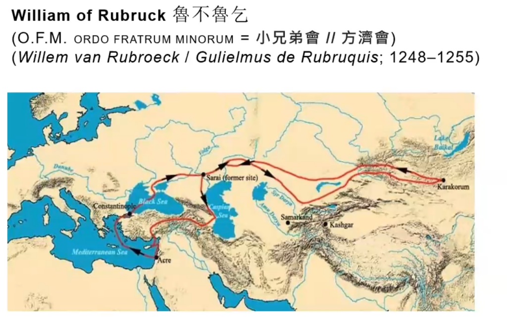 这是鲁不鲁乞7的游历路线,他属于天主教的一个修会——方济会(Francisco,又称小兄弟会)。因为小兄弟会鼓励会士过一种平衡的生活,所以鲁不鲁乞虽然出身于一个富有的家庭,但他从外表上看是比较贫穷的。这是天主教会历史上第一次与中国接触,就是在元朝时期。