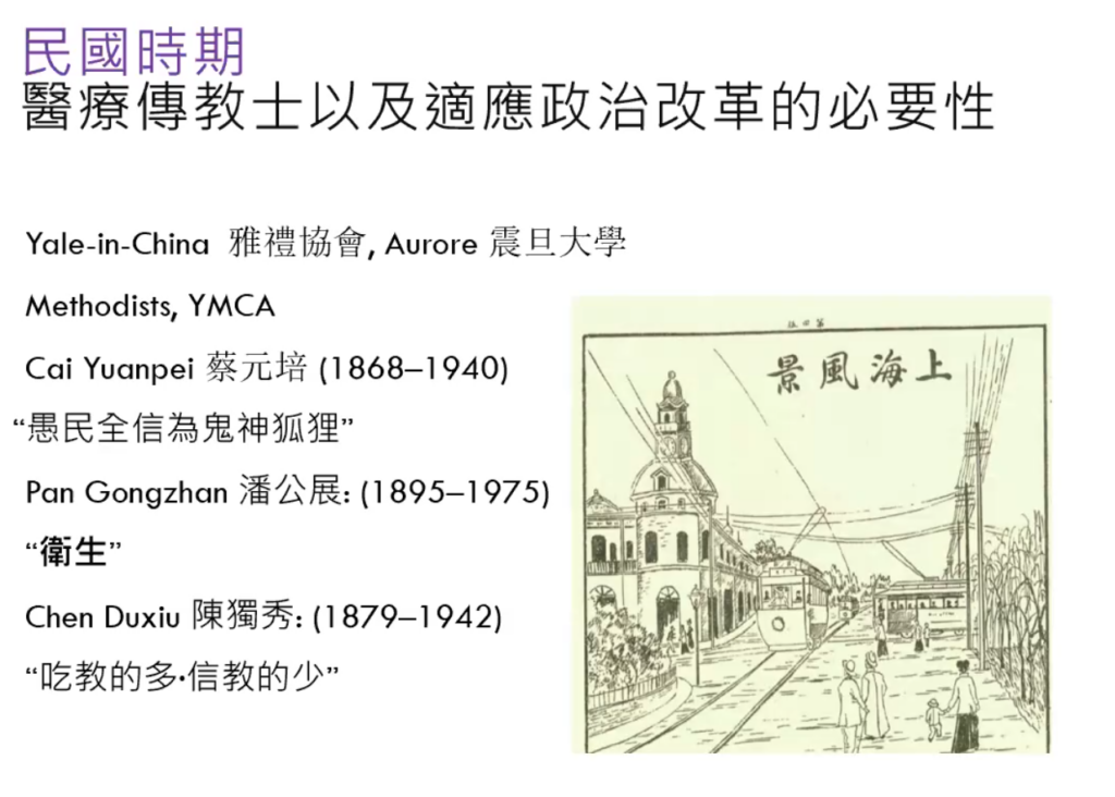 后来,伯驾(1804-1888)在广州创立了博济医学堂17,教授西方医学。孙博士(孙中山先生)就曾经在此学医。18这些“Medical Missionaries”(医疗传教士)除了教授西医之外,他们也反对有罪的行为,比如吸食鸦片。到了清朝末年至民国初期,来到中国的传教士越来越多。