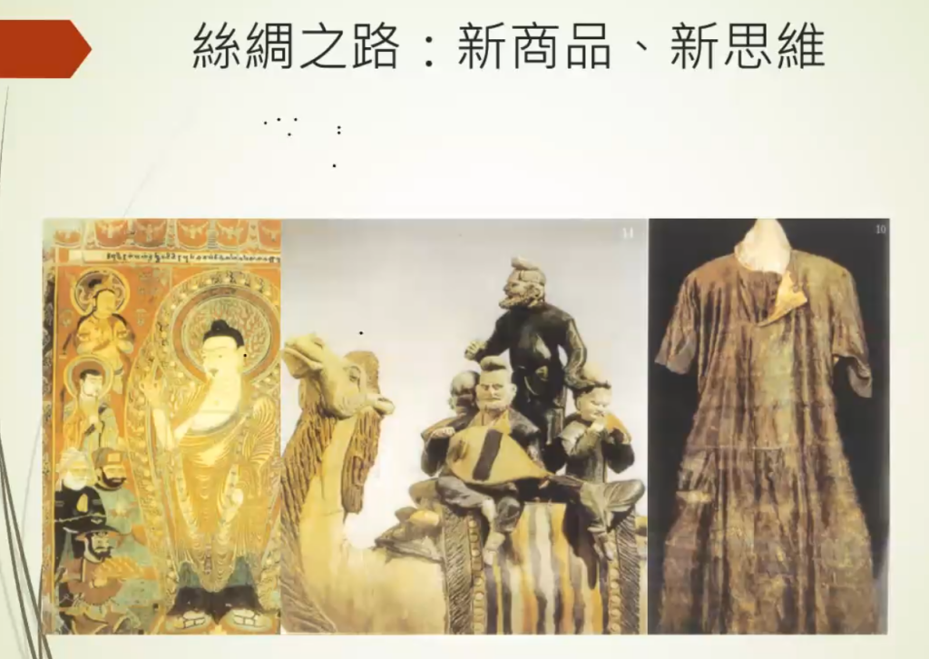 佛教的传播经过中亚,有一条非常重要的脉络,这条脉络就是商业路线。显而易见的,商业活动是各种民族交流思想文化的一种途径。现在你们看到的,是粟特人的人像。粟特人对我们历史学家来说是非常有趣的,他们最终皈依伊斯兰教徒。但在当时的历史背景之中,粟特人刚刚皈依佛教,之前也有很多人皈依了从西方传来的宗教,包括基督教(景教)。