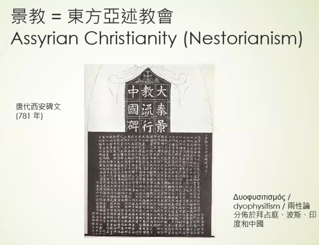这么说来,我们知道:景教就是我刚才所说的“东方教会”“东方亚述教会”,是叙利亚传统教会的一个分支。这个景教从神学上来说是广义基督教的一个教派。但是,他们与其他教派的最重要的区别,就是幻灯片右下角写的就是那个“两性论”。“两性论”的意思是说:基督有神性和人性,所以他在被绑在十字架上之前就已经是神。换言之,基督是百分之百的神,也是百分之百的人。对于没有学过基督教神学的人来说,他们不一定会理解其中存在的问题。但是,这对于当代罗马(天主教)和君士坦丁堡(东正教)的神学家来说,这是绝对不可接受的一种基督论3。