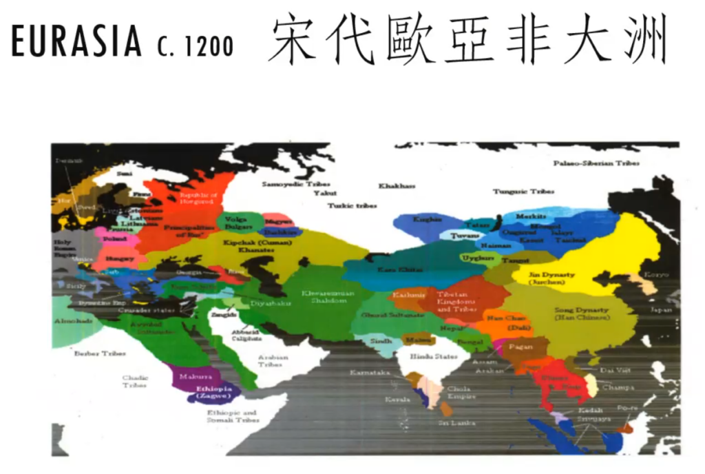 接下来,在唐朝之后,整个亚洲产生了很大的变迁。最大的变迁是将要发生的蒙古征服,即蒙古帝国的建立。这张地图呈现的,是蒙古帝国建立之前的欧亚大陆和非洲的一部分(主要是北非,包括埃及)。这对我们来说是很有趣的,因为我们看到的一些国家,比如说伊朗(波斯)和中国,产生佛教之后的印度,还有这个地方一直都是伊斯兰教的地区。伊斯兰教在那时就已经有500年左右的历史,它从西班牙的安达卢西亚4一直到中亚都有影响力,这是非常重要的一个观点,一个observation(通过观察得出的结论),也是我们应该了解的,这是第一点。第二,除了伊斯兰教,还有和最古老的《圣经》(希伯来圣经)有关的宗教——犹太教,以及基督教,这三种信仰在伊斯兰教地区,都有差不多的宗教性。当然,我们现在知道:这些地区都是受伊斯兰教影响的地方。但是,实际上有不少人(特别是文人、知识分子)虽然讲阿拉伯语,却信仰犹太教或基督教。换言之,讲阿拉伯语的人不一定都是穆斯林。