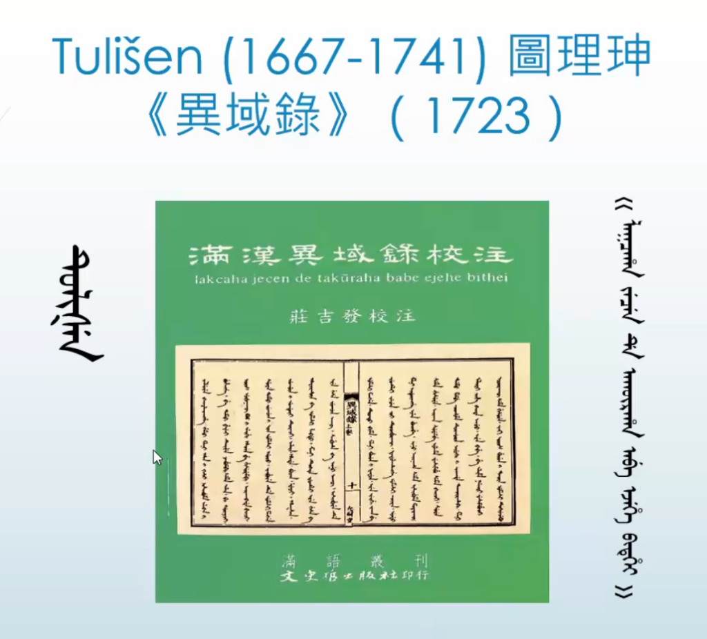 这本书——《异域录》,你可能没有读过,如果你有兴趣的话,这本书也有中文版(汉文版),值得一读。《异域录》是由图理琛9用满文写成的,他是一个地位很高的官员,他不是皇子而是旗人。这本书刚开始写作的时候,康熙皇帝还在位。到了《异域录》正式出版时,已经是雍正皇帝在位的时代。这本旅行日记挺有趣,他从北京一直走到了中亚和俄罗斯。