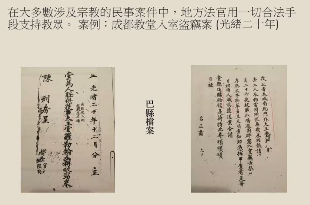 这是我在巴县收藏的清代档案当中找到的一个案例,这是光绪二十年(公元1894年)发生的事情,当时已经是清朝晚期。这些案例关键之处是:通常来说,官员虽然知道在很多地方有非法的传教活动,但是他们对于不参加天主教传教士的活动的教众,一般给予会帮助。例如这两件档案记载的,当地教堂失窃,官员设法追回了赃物并还给了教堂。当然,有时候官方和教众也有冲突。