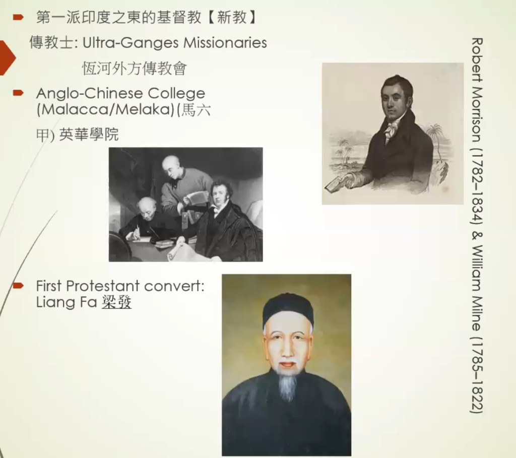 这些新教的传教士,在18世纪末(乾隆至嘉靖年间)才参加传教运动。他们开展传教工作的地区,第一是印度,第二是东南亚,第三就是中国。在这里,我们看到一个人——马礼逊(Robert Morrison)[^13],他在中国最初只招到一个信徒,就是梁发13。除了传教之外,他最主要的一项工作就是:在中国设立一所既能学习英文又能学习基督教教义的学校(即今英华书院)。另外,马礼逊还有一个同工——米伶(William Milne)14。米伶不是马礼逊的弟子(更像是助理),但他也是传教士,而且是一个自我要求非常严格的教士。马礼逊在马六甲开展传教事业的时候,不喜欢马来语,所以他只让米伶学习中文。