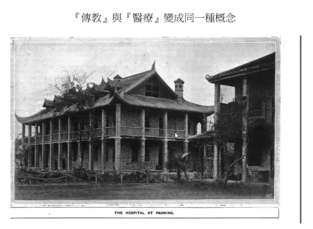这些传教士也做了另一件事——建立医院,例如这座在保宁(今四川阆中)的医院就是由传教士建立的。从此“医疗”和“传教”变成从同一个概念,这种观念影响到了所有的医疗传教士(Medical Missionaries)。自从《北京条约》签订之后,他们就在中国许多地方开设医院。