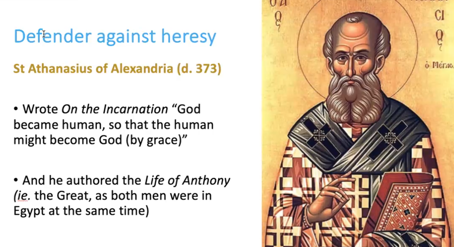 另一位早期对抗异端的教父是亚历山大的圣亚他那修(Saint Athanasius of Alexandria)公元373年安息主怀。他写了一部非常好的著作《道成肉身》(On the Incarnation)。这是第一本论述道成肉身的专著作,其中有句名言:“上帝成了人是为了让人可以藉着恩典成为上帝。” 他还写了一部《圣安东尼传》,就是埃及沙漠中的大圣安东尼的生平。这两位圣人身处同一时代,一位在亚历山大城,一位在沙漠地区。这位亚他那修教父因为护教曾被流放了五次。他反对阿里乌派,为三一上帝的信仰而辩护。阿里乌派源自于一个叫阿里乌的人,他教导基督与天父上帝并不等同。