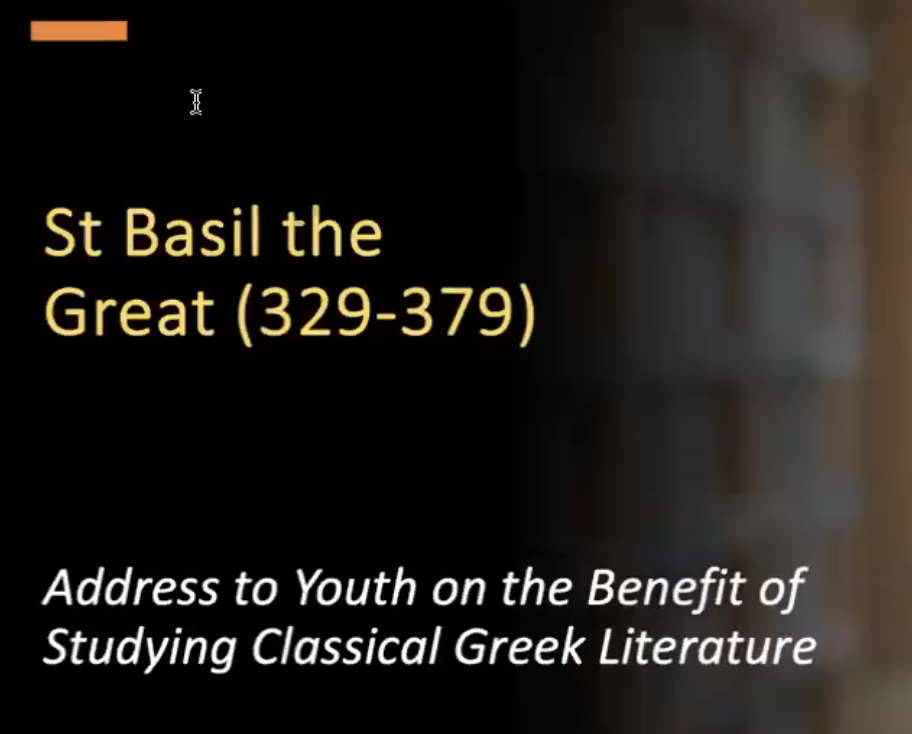 另外一位早期教父大圣巴西尔(St. Basil the Great,329-379)。他写了一篇短文给学习古典希腊文献的年轻人,论到这一学习的益处。
