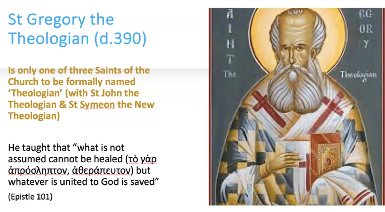 教父们还有一个重要的工作就是教导正确的信仰,处理各种异端。神学家格里高利(Gregory),公元390年荣归天家。他也是一位很好的典范。东正教有三位官方认定的神学家,一位是福音书的作者使徒约翰(John),还有神学家格里高利和生活在10-11世纪的新神学家西门(Simon)。神学家格里高利关于基督完全的人性和完全的神性有一个著名的论述。他认为:“没有被基督取得(assumed披戴、接受)的那部分人性就不会被医治,凡被上帝释放的就是被救赎的。” 他要强调的是,如果基督没有完全披戴人的肉身或者拥有人的完整意志,那么所谓的那一部分人的肉体或意志就没有办法得到上帝的医治;一旦基督完全地披戴了这些,即道成了肉身,那么我们人类的这些方面由于与基督的联合也就有了得救的盼望。大家可以在他的书信101篇中读到这些论述。另外,他谈到圣灵的神圣性时说:“要查考这些事件,基督降生源自圣灵感孕;基督在约旦河受洗,圣灵为其见证;基督行神迹,圣灵相随;基督升天之后,圣灵降下,取代他的位置。” 他用这些事件向我们阐明圣子与圣灵和谐同工。我们这些活在21世纪的人能否从这些神学中获得益处呢? 教父们曾为基督和圣灵的神性极力辩护,而我们今天依然对教父们的这些论述感兴趣吗?这些论述还会让我们的心里感到火热吗?我们对此的兴趣仅仅是某种爱好,还是以此为我们全部存在和整个生命中至关重要的利益呢?