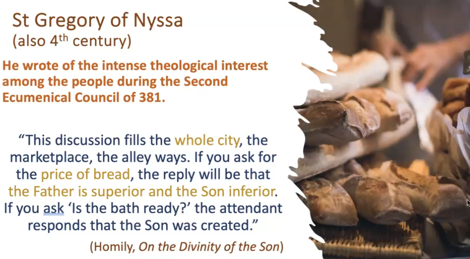既然谈到兴趣,我们来看看大圣巴西尔的弟弟尼萨的格里高利(St. Gregory of Nyssa),同样生活在4世纪。他曾提到第二次大公会议,即381年期间,在君士坦丁堡城里出现了一次民间讨论神学的热潮:“在市集上,街道上,整个城市都被这些讨论所充满了。如果你到商店里询问面包的价钱,回答将会是,圣父等级优于圣子。 如果你去公共澡堂洗澡,你问:‘可以洗吗?’ 里面的人会回应说圣子是被造的。” 换句话说,当时整个社会舆论空间里充斥的是与神学相关的讨论,虽然某些见解是错误的。我想告诉大家,在当时的社会,人们对这些神学主题非常有兴趣。我们很难想象在当今的社会有什么地方会像当时那样对神学争论如此热衷。在我看来,这方面的讨论只会发生在神学课上,在教会里或者像我们这样在网上交流。我劝大家对此做些反思。