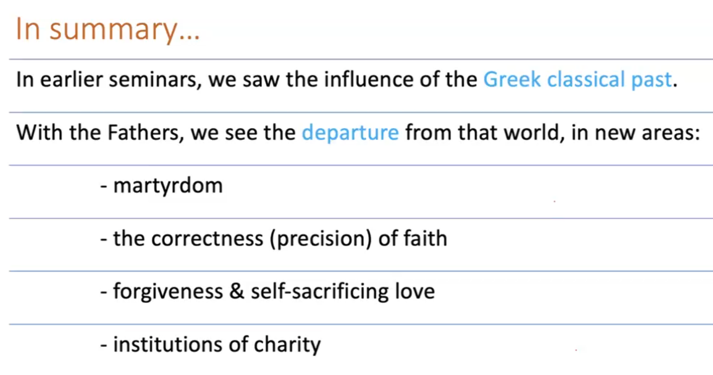 总结,在前几次讲座中,我们看到古典希腊哲学如何影响了基督教。今天我们跟随着教父离开了古典希腊哲学时期,进入了一个新的领域。首先,殉道。其次,正确的信仰,有很多古代的教父文献都指出,你如果要得到拯救,就必须有一个正确的信仰。其三,饶恕和在爱中的自我奉献,爱这个词在基督诞生以前似乎并不是希腊哲学家们喜欢探讨的话题。其四,社会的慈惠事工,这是教会在其后支持和推动的事工。