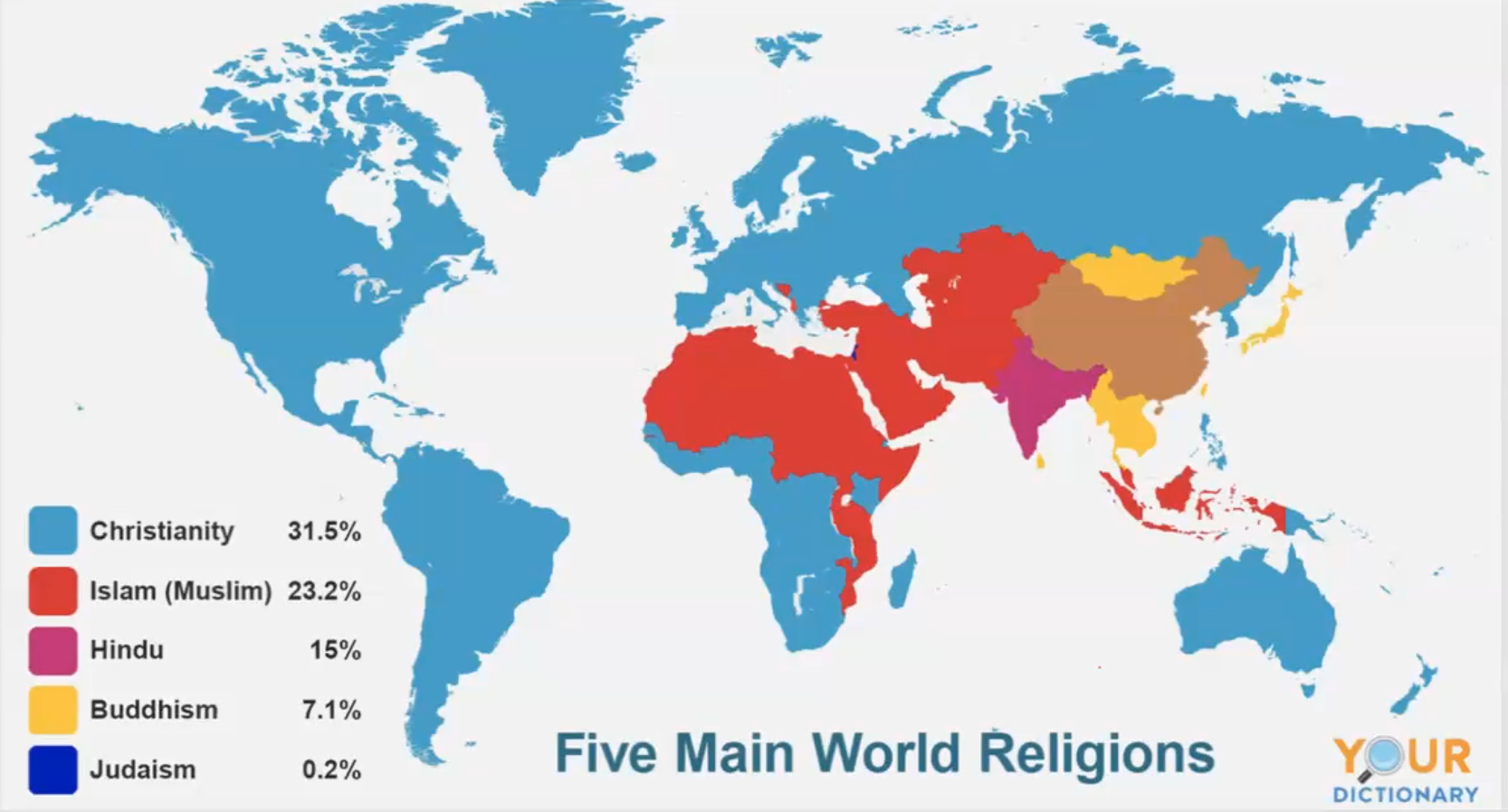 接下来我们来梳理一下世界上的宗教。 正如你们所知在这个世界上有很多的宗教,其中较为主流的有五个。基督教信仰群体拥有的人数最多;伊斯兰教第二;印度教可能是最古老的一种宗教信仰。