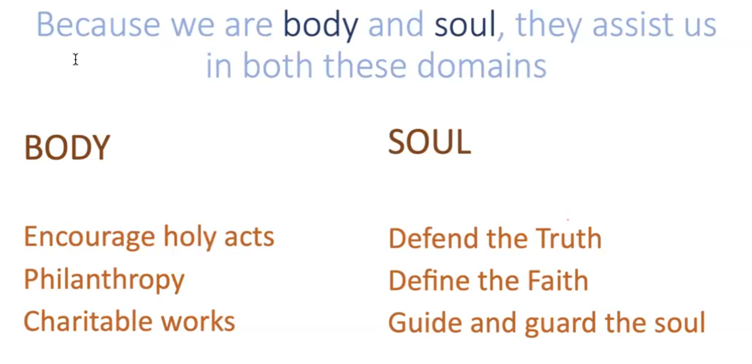 上图中左边是教父们在身体方面给我们的一些帮助。就外在行为而言,他们鼓励我们去过一种圣洁、仁爱,乐善好施的生活;在属灵上,他们希望我们能够捍卫真理和卫护信仰。同时,他们也引导和保护我们的灵魂,这是一种全人的帮助和保护。