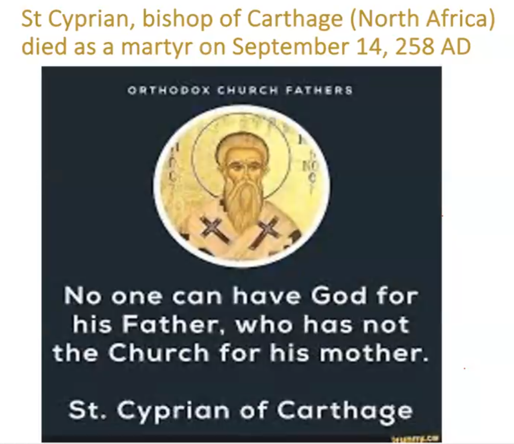 我们要看的第二位是北非迦太基的主教居普良(Syrian),于公元258年殉道。迦太基是北非的一座沿海城市。每年的9月14日是这位主教的纪念日,今年是第二百八十年。他最著名的言论是:“如果人不以教会为母,他就无法以上帝为父。” 由此可见教会的重要性,这也正是基督建立教会的原因。