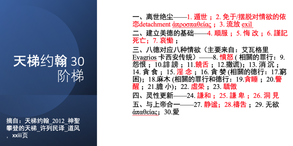 我们再来比对7世纪出现的,著名的灵修著作《天梯》的主题。从下图可以看到,作者“天梯约翰”把灵修的阶段分为30个阶梯,而这30个阶梯的大部分,与《沙漠教父言行录》的《主题版》有许多类似、甚至一致的内容,比如遁世、免于情欲、顺服、悔改、静谧等等。
