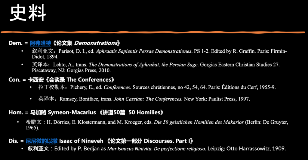 从叙利亚传统出来的史料有大马加略、阿弗哈特、圣以撒、《爱神集》译作节选,而这是本讲座梳理的重点。