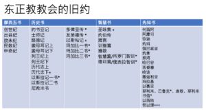 上面这个表格显示东正教会的旧约,是希腊正教会使用的旧约,它分为四个部分,摩西五书、历史书、智慧书和先知书,以这样的次序来排列。我用的这些书名汉译,有的是新教的译法,有的是天主教的译法。有些书卷加了星号,加星号的书卷是正教旧约全书的一部分,**在新教旧约中没有这些书卷,而在天主教,它们还有另一个名字叫次经或旁经,但是这些书卷在正教会的旧约里,就是旧约的一部分,没有正典和次经之分。**还有一些书卷,比如历代志下和圣咏集,还有但以理书,又加了一个十字号,在东正教会的这些书卷中,因为它是来自希腊文版的圣经,它的书名是一致的,但是它比马索拉文本的圣经要多出一些内容,比如说上次我讲到但以理书的时候,在第三章里,三个青年被投进了火炉,因为他们拒绝崇拜巴比伦的王,他们在火炉中看到了神显,有天使一样的形象来拯救了他们,为他们洒下了甘露,所以他们毫发无损地走出了火炉。这个故事在希腊文版和和希伯来文版圣经中都有,只是在希腊文圣经中,除了这个故事的叙述之外,还有这三个青年的祷词和赞美诗,这些都是但以理书中的一部分;还有更多关于但以理的故事,也收集在希腊文版的但以理书中,比如说那个恶龙的故事,还有苏珊娜的故事,这些都是关于但以理的传说,也收集在希腊文版的但以理书中。