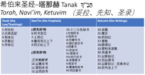 上面的表格,是希伯来文的圣经,希伯来圣经的正典叫做“塔那赫”,妥拉、先知书和圣录。它的基本的书卷都是一样的,在希伯来圣经中一共有24卷书,这24卷书是在它的正典中确立下来的,正好相当于希伯来文字母表中的24个字母,所以它是具有象征意义的,它代表了人类语言的全部(或者天主言语启示的全部)。除了妥拉这五本以外,我们所谓的历史书,在希伯来圣经中被称为前先知书。而撒母耳记不是两本,而是一本,因为它是抄在一个羊皮卷上的,列王纪也是一本,因为它也是抄在一个羊皮卷上的。三大先知书是单独抄的,十二小先知书抄在一个卷上成为了一卷书,这样它就有24卷书。