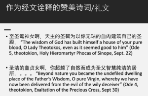 赞美诗和礼文也是在给经文作注释,举个例子,这是9月22日纪念一位殉道的圣徒的时候,献给诞神女的赞美诗,其中一句就说“至圣诞神女啊,天主的圣智——基督,为以你无玷的血肉建筑自己的圣殿”,就是说这个智慧建立的圣殿就是诞神女,当然它是一个象征的表达。在9月30日庆祝高举圣十架节的时候,有这样一首赞美诗,其中有一句是说“圣洁的童贞女啊,你超越了自然而成为圣父智慧纯洁的居所”,诞神女从象征意义上来说就是天主的圣殿,智慧为自己打造了这样一个圣所。所以赞美诗是以经文为基础,同时又为经文作解释。