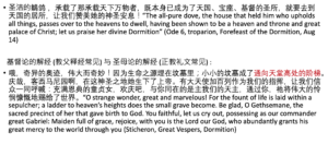 还有其他的例子,圣洁的鶵鸽,诞神女被比喻成献祭的圣洁的鸽子,承载了那承载天下万物者,那么天主基督就是承载天下万物的那个人,而诞神女又是承载了天主的那个人,所以她本身,因为承载了天主,就成为了天国,天主居住的地方不就是天国吗?她就成为了宝座,天主所在的地方不就是他的宝座吗?她就是基督的圣所。同时,在她安息的时候,她就要去到天国的居所,让我们赞美她的神圣安息,这是一首赞美诗。