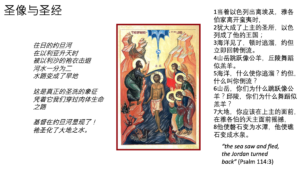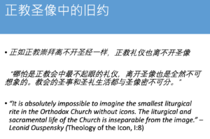 最后就是在视觉上,旧约作为视觉的表现,在正教会的崇拜中是怎么使用的?这里有一段引述,Leonid Ouspensky是一位研究圣像的专家,他说“哪怕是正教会中最不起眼的礼仪,离开圣像也是全然不可想象的。教会的圣事和圣礼生活都与圣像密不可分”。圣像是礼仪和信仰生活密不可分的一部分,那么圣像在正教会中起什么作用呢?可以简单地把它概括为三个作用,第一个作用是教育和教化,特别是在古代,比如说大马士革的圣若望说“经书是给识字的人的,那么圣像就是给不识字之人的,文字诉诸听觉,而圣像诉诸视觉,赋予人理解力”,当人们不能够读书认字的时候,圣像就起到了传播福音的作用,它们为你介绍经书的内容,通过视觉的方式,用不同的媒介来表现同样的真理。第二个作用是礼仪的功能,就是我们所说的在正教会的崇拜中起到的功能。第三个作用,我把它解释为灵修或者圣化人的功能,其实它原来的意思是Anagogical,是向上的意思,人的上升,就像基督升天一样,其实我们最终的方向也是向上,这就是圣化的功能。还有一些说法是圣像是通往圣洁的乘具,是通向天国的门窗,你怎么才能窥向天国呢?通过圣像就像打开了一扇窗户一样。