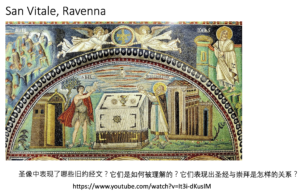 给大家再看一幅圣像,这是在意大利,意大利的Ravenna有一座教堂叫做San Vitale,它的墙上布满了圣像。其中这一幅全是旧约中的形象,这里有摩西在西奈山看到的树丛着火,但是却没有烧毁。这是以赛亚先知看到的天使唱圣哉、圣哉、圣哉。那么在这里,它是一个祭桌,这是在古代的教会进行圣礼仪的地方。大家看到的字是什么?一个是亚伯,另一个是麦基洗德。为什么在在基督教会的祭坛旁要出现旧约的人物呢?他们和基督是什么关系呢?为什么一方面要有亚伯的献祭,一方面要有麦基洗德的献祭呢?我把这个留给大家作为一个思考,圣像中表现了哪些旧约经文,他们是如何被理解的?这些经文被赋予了什么样的意义?它们表现出圣经和崇拜是怎样的关系?