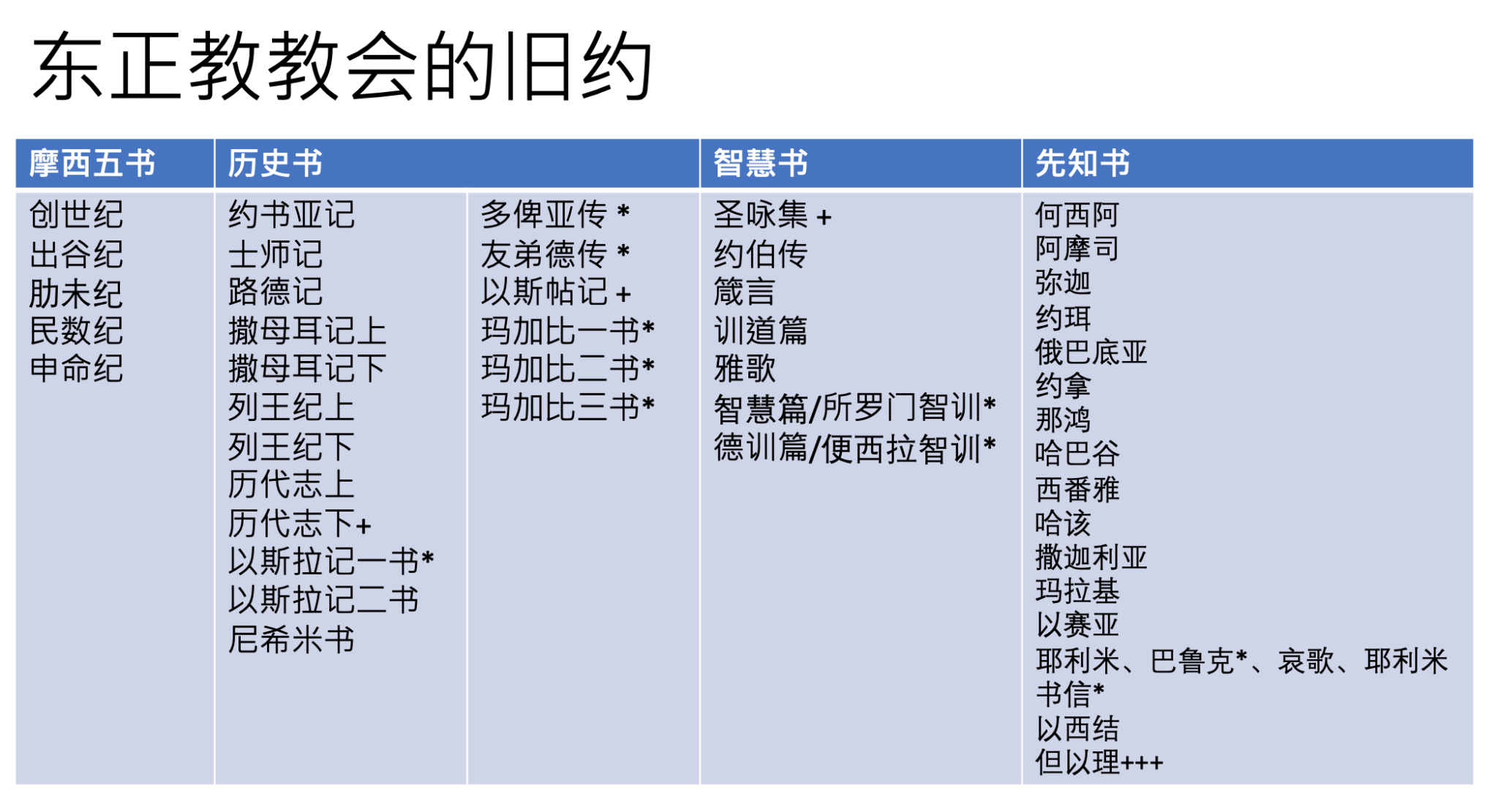 上面这个表格显示东正教会的旧约,是希腊正教会使用的旧约,它分为四个部分,摩西五书、历史书、智慧书和先知书,以这样的次序来排列。我用的这些书名汉译,有的是新教的译法,有的是天主教的译法。有些书卷加了星号,加星号的书卷是正教旧约全书的一部分,**在新教旧约中没有这些书卷,而在天主教,它们还有另一个名字叫次经或旁经,但是这些书卷在正教会的旧约里,就是旧约的一部分,没有正典和次经之分。**还有一些书卷,比如历代志下和圣咏集,还有但以理书,又加了一个十字号,在东正教会的这些书卷中,因为它是来自希腊文版的圣经,它的书名是一致的,但是它比马索拉文本的圣经要多出一些内容,比如说上次我讲到但以理书的时候,在第三章里,三个青年被投进了火炉,因为他们拒绝崇拜巴比伦的王,他们在火炉中看到了神显,有天使一样的形象来拯救了他们,为他们洒下了甘露,所以他们毫发无损地走出了火炉。这个故事在希腊文版和和希伯来文版圣经中都有,只是在希腊文圣经中,除了这个故事的叙述之外,还有这三个青年的祷词和赞美诗,这些都是但以理书中的一部分;还有更多关于但以理的故事,也收集在希腊文版的但以理书中,比如说那个恶龙的故事,还有苏珊娜的故事,这些都是关于但以理的传说,也收集在希腊文版的但以理书中。