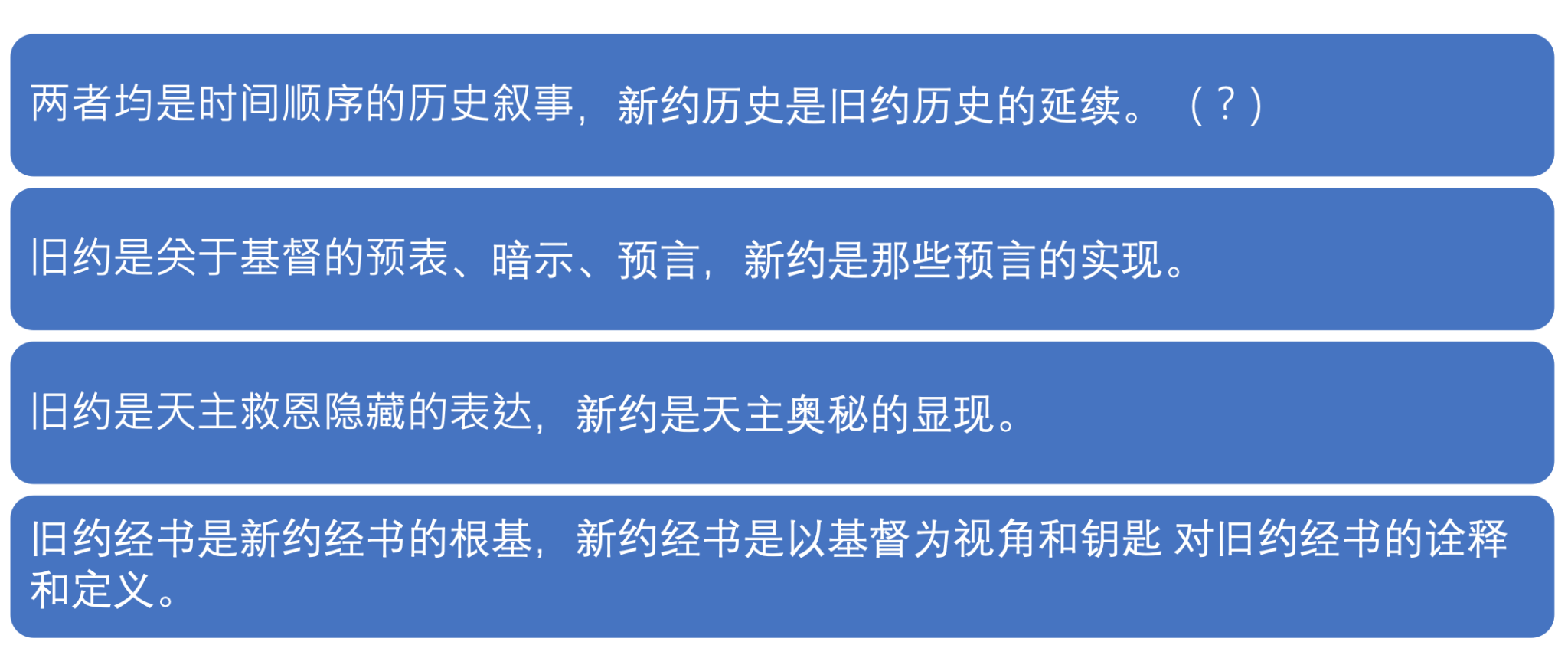 为什么要用旧和新这样的形容词呢?是不是新就是好的,旧就是不好的,过时的,要被淘汰的呢?(显然我们不是这个意思)。但是旧呢,它也可以是古旧,古旧是由远古时代而来的,是有名望的、有权威性的。我们说的这个旧,就是古老的、有名望的、有权威性的概念。还有一个就是涉及到如何读经和解经的问题,旧约和新约是什么样的关系呢?显然它们之间是紧密联系的,但是怎么理解它们之间的关系呢?