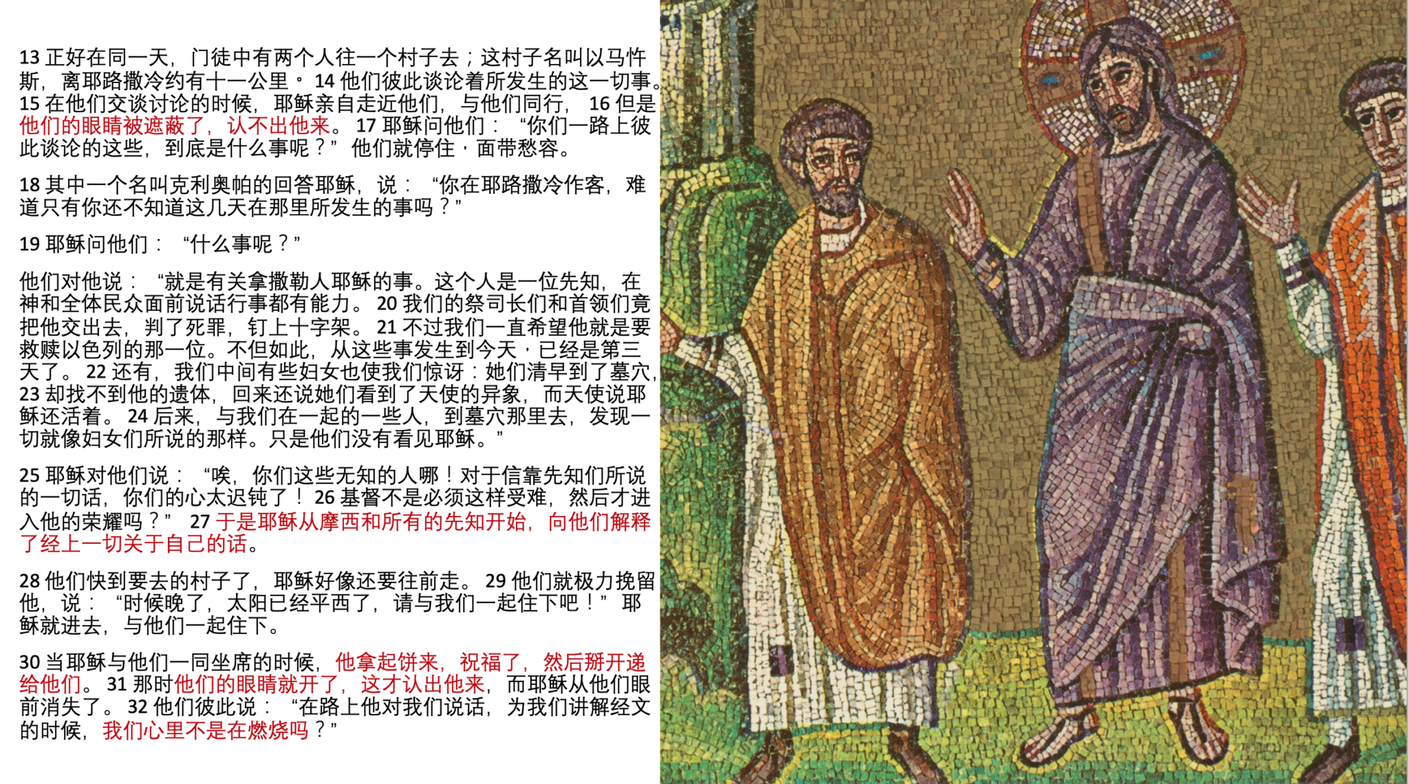 从新约来看,路加福音中给我们讲了一个非常重要的故事。在基督复活之后,很多人都看到了复活的基督,但是他的门徒还是非常地疑惑,这一天有两个人,他们正在朝着以马忤斯走去,一边走,他们一边在交谈,这时一个路人过来了。但非常有意思的是,经文说“他们的眼睛被遮蔽了,认不出他来”,这是一个非常奇怪的事情,难道基督在世上的时候,他们没有和他在一起生活过吗?三年的时间,他们追随他,为什么这个时候他们的眼睛被遮蔽了,认不出他来呢?这是非常奇怪的事情。耶稣问他们,你们在谈什么呢?就是有点开他们玩笑的意思。
