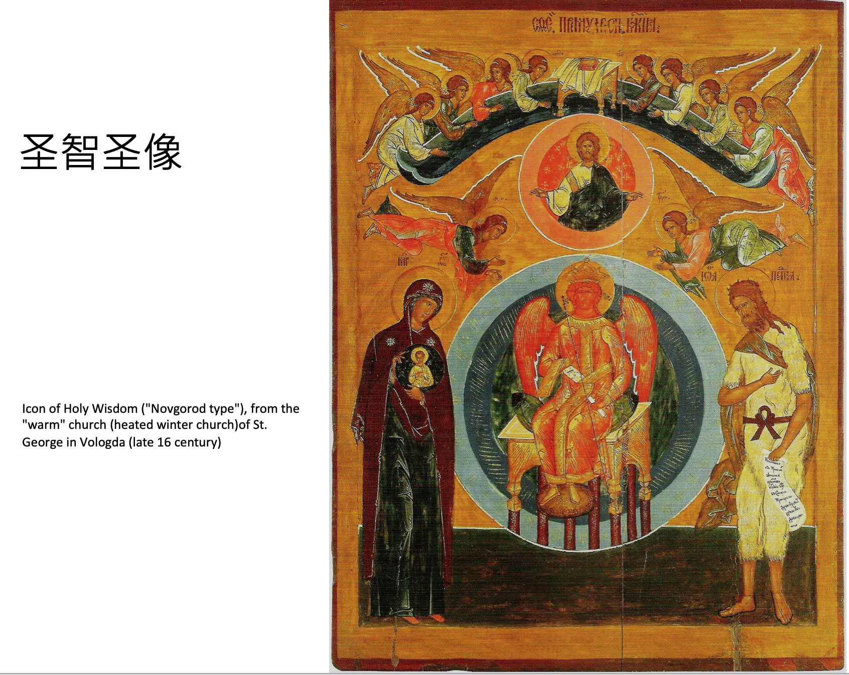 这个是16世纪在俄罗斯风格的圣像,它描述的是天主的圣智慧,显然天主的圣智慧就是耶稣基督,在这幅圣像里,我们看到耶稣基督以至少四种方式向我们显示,基督在旧约中隐藏的形象,首先是上帝的圣言,上帝的圣言是在最高这个地方,它是一个献祭的祭桌,在祭桌上有一部书,这部书就是象征天主的圣言,耶稣基督就是天主的圣言。然后下面这个光环,称Mandorla, 代表光环之内显示的只有凭着信仰的眼睛才能看到,一般人是看不到,有种象征的意义。在这里我们看到天主的儿子,圣子道成肉身的形象。祂的手势其实讲的就是三一上帝,还有祂的神人二性,祂用手指来表示。第三个形象是在下面,这个光环也是通过信仰的眼睛才能看到的,其实是一个天使的形象。这个天使的形象就是圣智慧。为什么呢?祂坐在一个宝座上,祂建立了一个宝座,这个宝座也可以看作是他的圣殿,宝座建立在七根柱子之上,这显然就是以箴言第九章的经文为基础了,智慧建造房舍,雕琢了七根石柱,邀请人来到圣殿中参与祂的圣礼仪,吃祂的食粮、饮祂的酒。但不光是这样,这是旧约中的天主圣智的显现,在新约中也有表现。在新约中,耶稣基督是作为诞神女唯一的儿子而出现的,本无始无终的祂以道成肉身真正进入了人类的历史,由诞神女为他作证,还有先驱者圣若望为祂来作证。所以这幅圣像,其实它也是以经文作为基础的,只有理解了圣经,才能正确地来解读这些圣像。