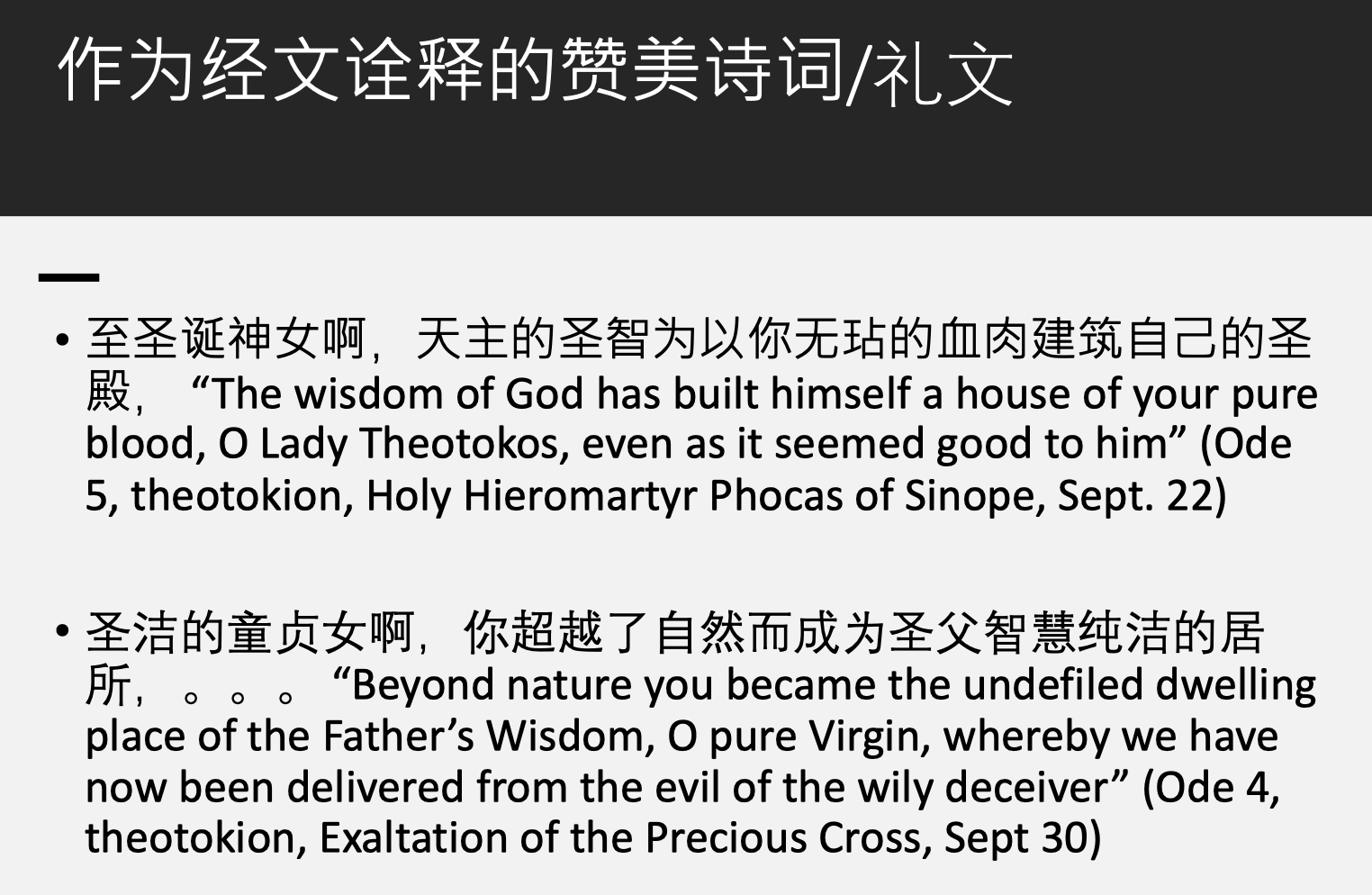 赞美诗和礼文也是在给经文作注释,举个例子,这是9月22日纪念一位殉道的圣徒的时候,献给诞神女的赞美诗,其中一句就说“至圣诞神女啊,天主的圣智——基督,为以你无玷的血肉建筑自己的圣殿”,就是说这个智慧建立的圣殿就是诞神女,当然它是一个象征的表达。在9月30日庆祝高举圣十架节的时候,有这样一首赞美诗,其中有一句是说“圣洁的童贞女啊,你超越了自然而成为圣父智慧纯洁的居所”,诞神女从象征意义上来说就是天主的圣殿,智慧为自己打造了这样一个圣所。所以赞美诗是以经文为基础,同时又为经文作解释。