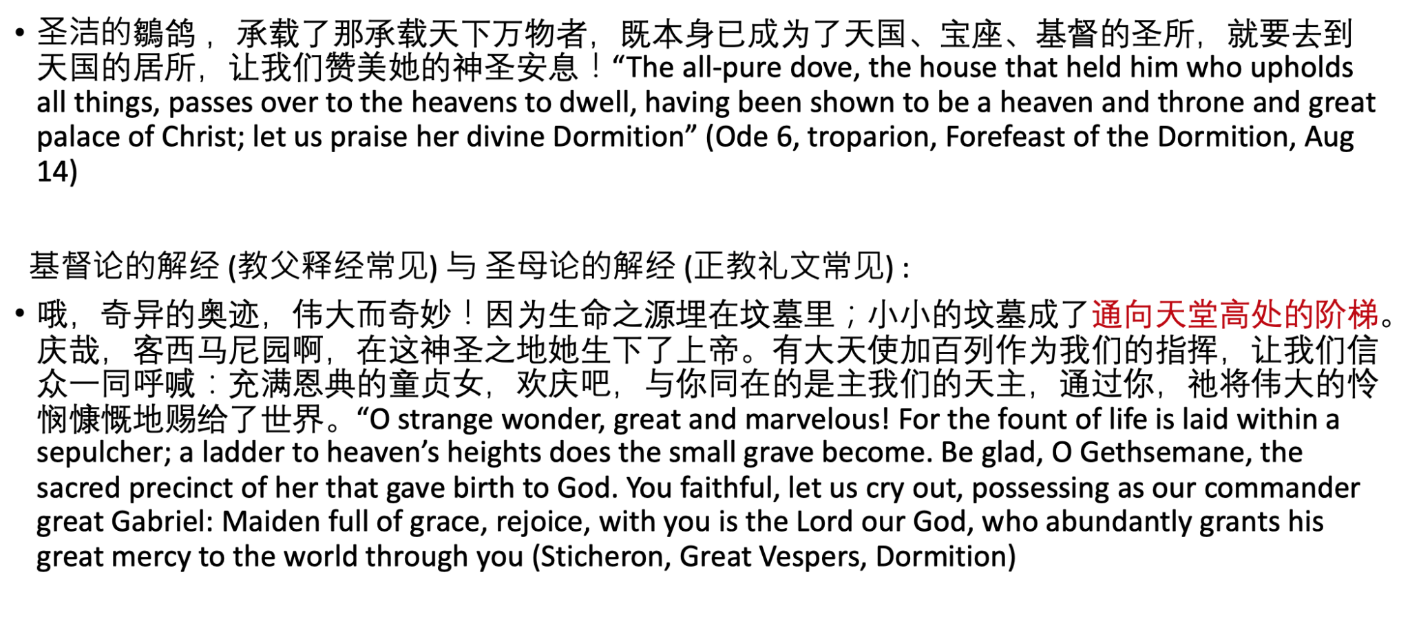 有一个非常有意思的现象,在正教礼文中所见到的解经方式和教父在解经中所常见的方式有一点微妙的不同,就向我们证明了圣经经文没有唯一正确的解释。它其实是一个宝藏,为我们用来表述信仰提供了很多无穷尽的资源,那么这个非常微妙的不同在什么地方呢?教父经常是以基督论的角度来解经,在教父的解经中,雅各看到的天梯就是基督,基督就是连接神和人的中间,祂是完全的人,也是完全的神,是因为祂,我们才能到达天上,到达天父,因此祂就是那个阶梯。但是在礼文中常常使用的是圣母论的解经原则,比如这一段,这是在圣母安息节的时候唱的,奇异的奥迹,伟大而奇妙,因为生命之源埋在坟墓里,那么这生命之源是谁?生命之源就是基督,祂就是那活水源,生命之源埋在坟墓里,这个坟墓有两个含义,一个是诞神女的子宫,一个是真正埋葬祂的那个坟墓。从天上取得了人性而成为肉身,其实就是下降到坟墓里,所以童贞女的子宫就成为了坟墓的象征。小小的坟墓成了通向天堂高处的阶梯,庆哉,客西马尼园啊,客西马尼园是现在的耶路撒冷,我们知道在它的旁边就是诞神女的空墓,为什么是空墓呢?因为她在安息之后,身体和灵魂一起被天主接到天上了,所以是一个空墓。客西马尼园啊,在这神圣之地,她生下了上帝,有大天使加百列作为我们的指挥,让我们信众一同呼喊:充满恩典的童贞女,欢庆吧,与你同在的是主我们的天主,通过你,祂将伟大的怜悯慷慨地赐给了世界。在礼文中把天梯解释成圣母,由于她,所以基督能够从天而降,道成肉身,成为拯救我们的源泉。因此。教父释经和礼文解经有不同的角度,一个是基督论的角度,一个是圣母论的角度。