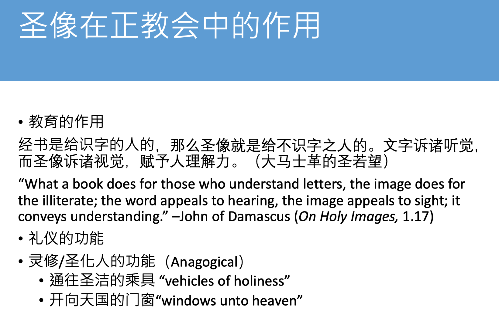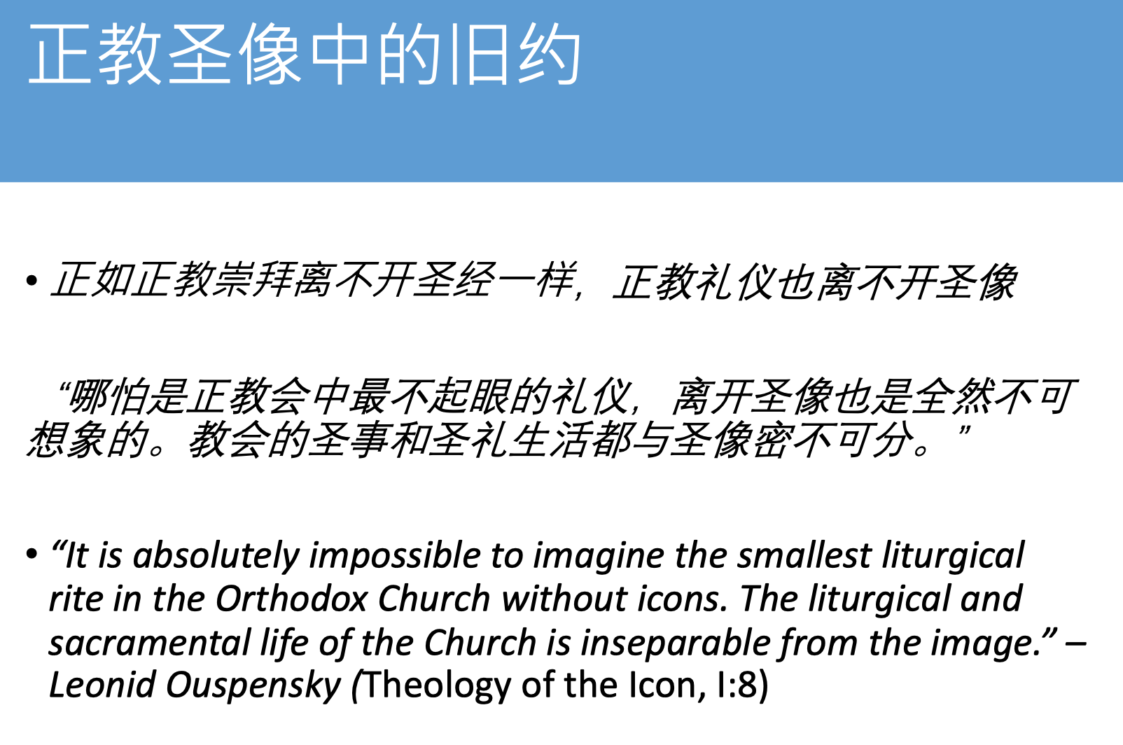最后就是在视觉上,旧约作为视觉的表现,在正教会的崇拜中是怎么使用的?这里有一段引述,Leonid Ouspensky是一位研究圣像的专家,他说“哪怕是正教会中最不起眼的礼仪,离开圣像也是全然不可想象的。教会的圣事和圣礼生活都与圣像密不可分”。圣像是礼仪和信仰生活密不可分的一部分,那么圣像在正教会中起什么作用呢?可以简单地把它概括为三个作用,第一个作用是教育和教化,特别是在古代,比如说大马士革的圣若望说“经书是给识字的人的,那么圣像就是给不识字之人的,文字诉诸听觉,而圣像诉诸视觉,赋予人理解力”,当人们不能够读书认字的时候,圣像就起到了传播福音的作用,它们为你介绍经书的内容,通过视觉的方式,用不同的媒介来表现同样的真理。第二个作用是礼仪的功能,就是我们所说的在正教会的崇拜中起到的功能。第三个作用,我把它解释为灵修或者圣化人的功能,其实它原来的意思是Anagogical,是向上的意思,人的上升,就像基督升天一样,其实我们最终的方向也是向上,这就是圣化的功能。还有一些说法是圣像是通往圣洁的乘具,是通向天国的门窗,你怎么才能窥向天国呢?通过圣像就像打开了一扇窗户一样。