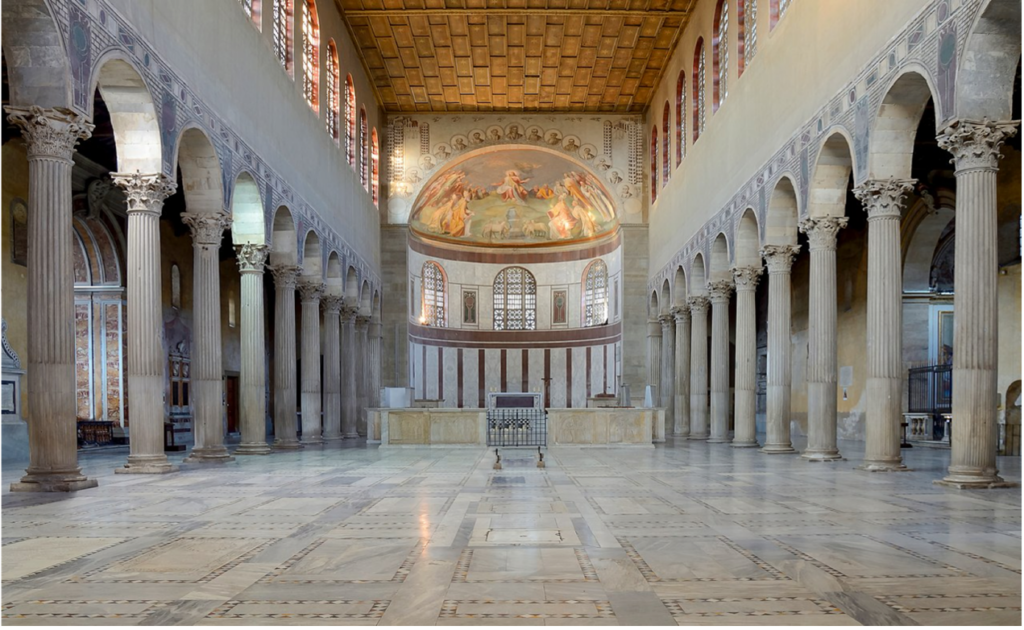 在教堂内部,我们可以看到,它是一个长方形的主体结构,两侧有两排柱子,将中厅与两边的走廊分隔开,上方有一排天窗用于采光。在中厅的顶部,有一个半圆形的后殿,围绕着这个半圆形的后殿是神职人员就坐的地方,而中间的位置,就是主教的座位,主教的座位在进行圣礼的圣坛后方,这个位置被称为Cathedral,这就是为什么后来的大教堂会用Cathedral作为名字的原因。在罗马公共议事厅中,主教的座位就是罗马的裁判官的座位。从这个建筑的例子,我们可以看出,当基督教进入公众视野,它打破了公众空间与私人空间的界限,把个人信仰带入公共领域。