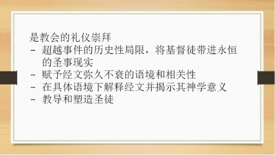 - 第三,在这种具体的语境下,礼仪崇拜实际上起到了解释经文的作用,特别是在礼仪中使用的礼文。