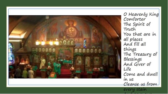 在圣灵降临节之后,我们就要借着圣灵,在灵内对上帝祈祷。在这个节期内,我们每次祈祷所念诵的开篇祷文(正教圣灵祷文)如下: