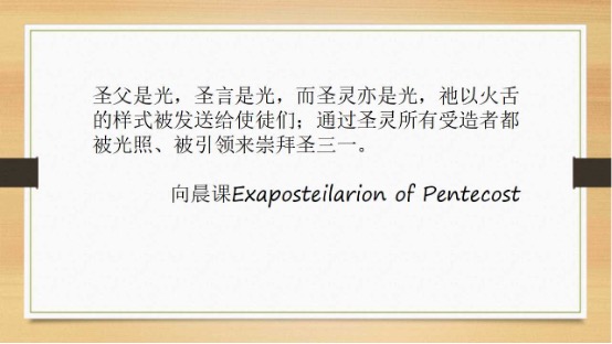“让我们信众来欢庆这最终的节日:这是五旬节,应许和指定的时日都在此时实现。因为在今日,圣善者护慰师的火焰直下到大地之上,像火舌一样,祂光启了众门徒,使他们被接纳为天国的成员。看呐,护慰者的光已经降临,光启了整个世界。”